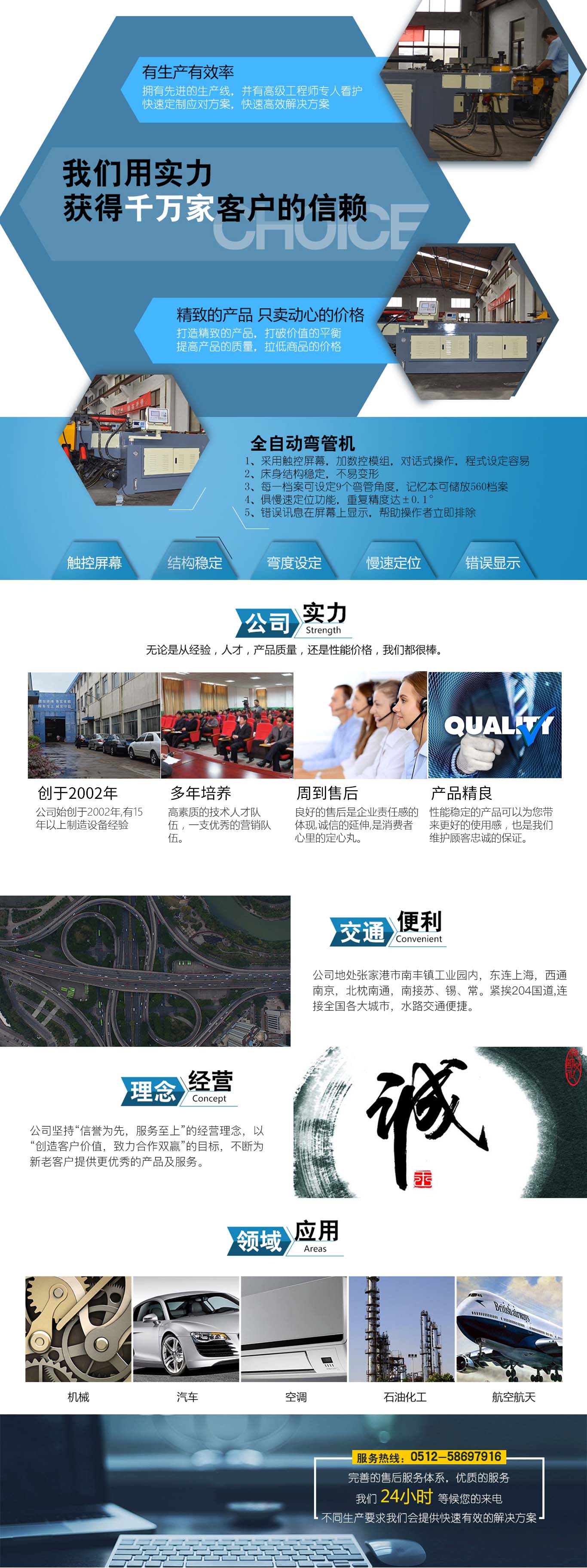 張家港市雙和機械制造有限公司始建于2001年,占地面積12000平方米,南鄰蘇州、無錫、上海,東鄰常州、南京,交通便利,位長三角中間地段,風(fēng)景優(yōu)美的張家港。 雙和公司至創(chuàng)立開始,引進了國外的設(shè)計制造理念,組建了企業(yè)生產(chǎn)管理優(yōu)秀團隊,致力于管材加工機械研發(fā)、設(shè)計、制造。創(chuàng)新的設(shè)計理念,嚴格的質(zhì)量把關(guān),專業(yè)的售后服務(wù),不斷提升了我在整個行業(yè)的影響力。 雙和公司生產(chǎn)的系列產(chǎn)品分為彎管機、切管機、縮管機、磨齒機、伺服彎管機、數(shù)控彎管機、液壓彎管機、自動切管機、管端成型機、倒角機、大弧滾圓機、鋁切機、壓彎機等管材加工機械,廣泛用于航天業(yè)、造船業(yè)、汽車制造、鍋爐制造、自行車、摩托車、體育健身器材、管制品家...